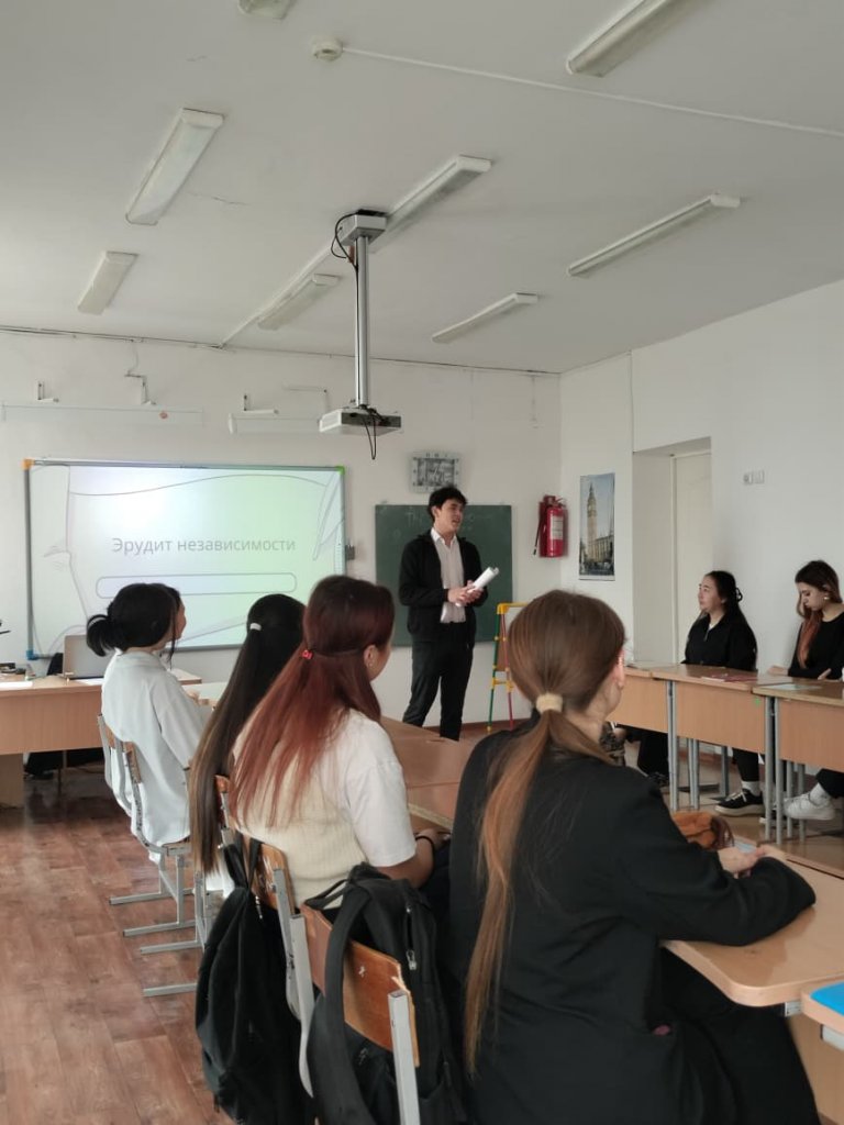 3 желтоқсанда ағылшын тілі мұғалімі Е. К. Жұмабаев оқушылар арасында "Тәуелсіздік эрудиты" атты зияткерлік ойын өткізді. Ойын барысында оқушылар кең ой-өрісін көрсетті, белсенді және командада жұмыс істей білді. Балалар Қазақстанның тарихы мен мәдениеті...