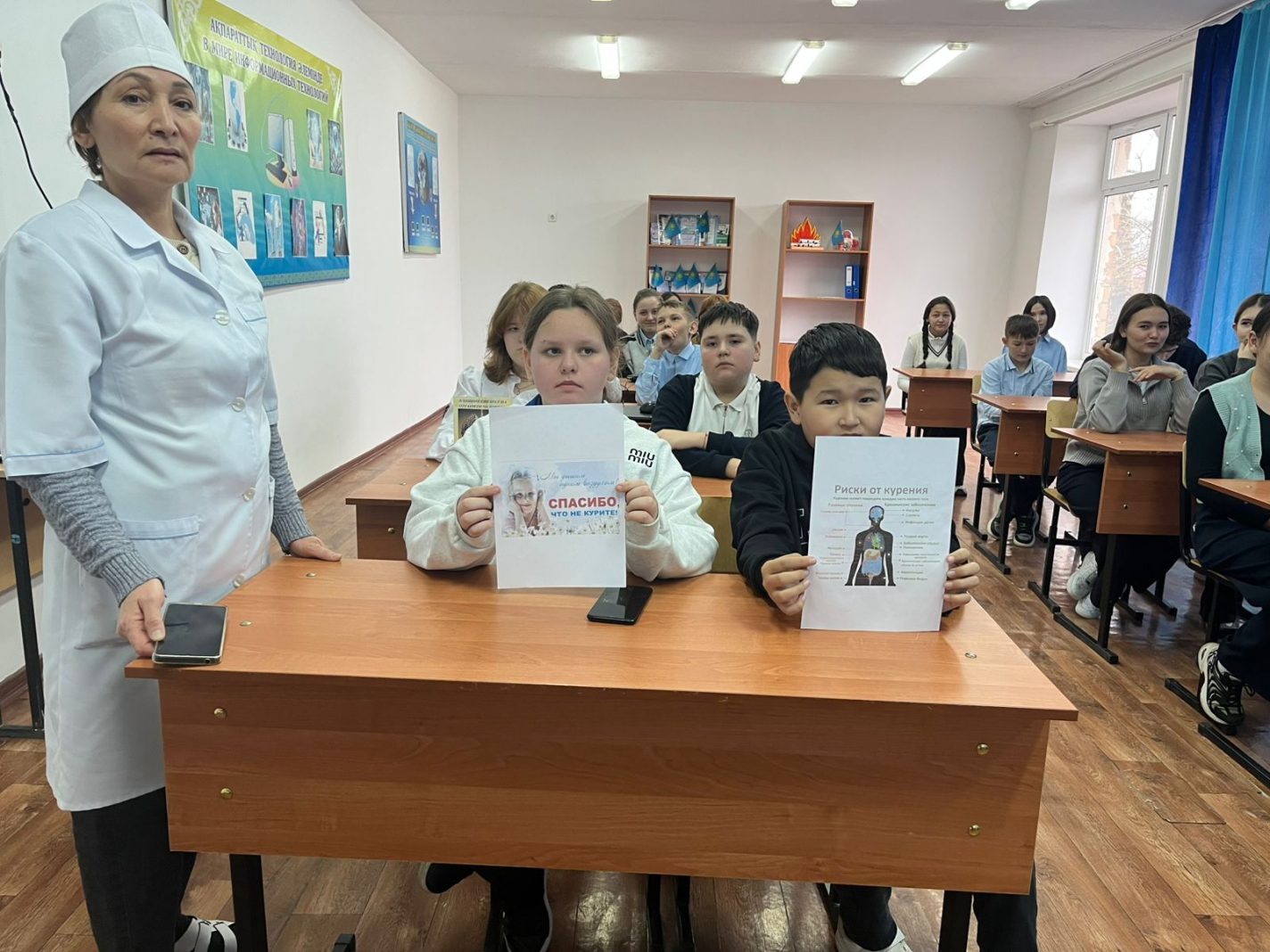 12 қарашада мектептің медицина қызметкері Б.С. Мaжитова 5-11 сынып оқушыларымен "Темекіні тастауға тамаша күн. Пассивті темекі шегу" Халықаралық темекіні тастау күніне орайластырылған іс – шара өткізді. Жалпы қамту 41 оқушы
